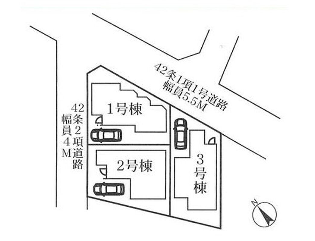 | 駐車場 | 1台 | 道路の幅員 | 3号棟:北東5.5m /1号棟:北西4m 北東5.5m /2号棟:北西4m |