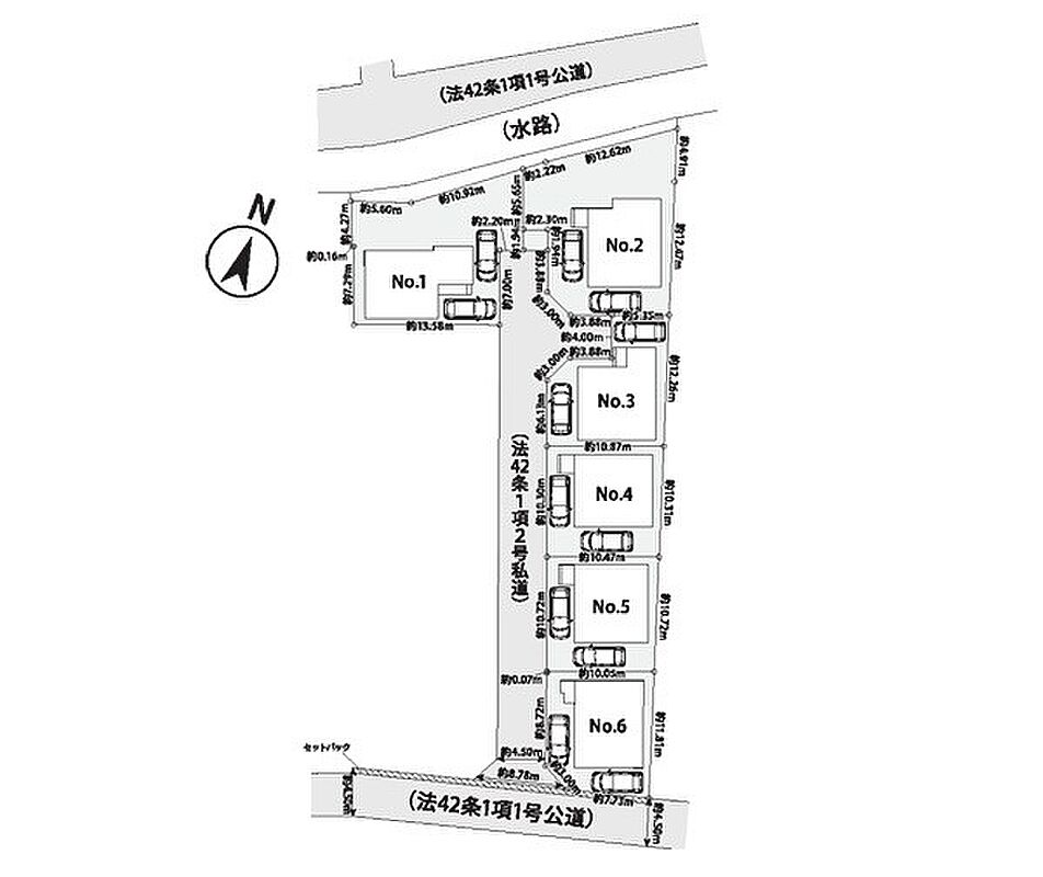 | 駐車場 | 2台 | 道路の幅員 | 3号棟:西4.5m /6号棟:西4.5m 南4.5m /1号棟:東4.5m |