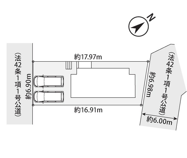 | 駐車場 | 2台 | 道路の幅員 | 1号棟:南西4m 北東6m |