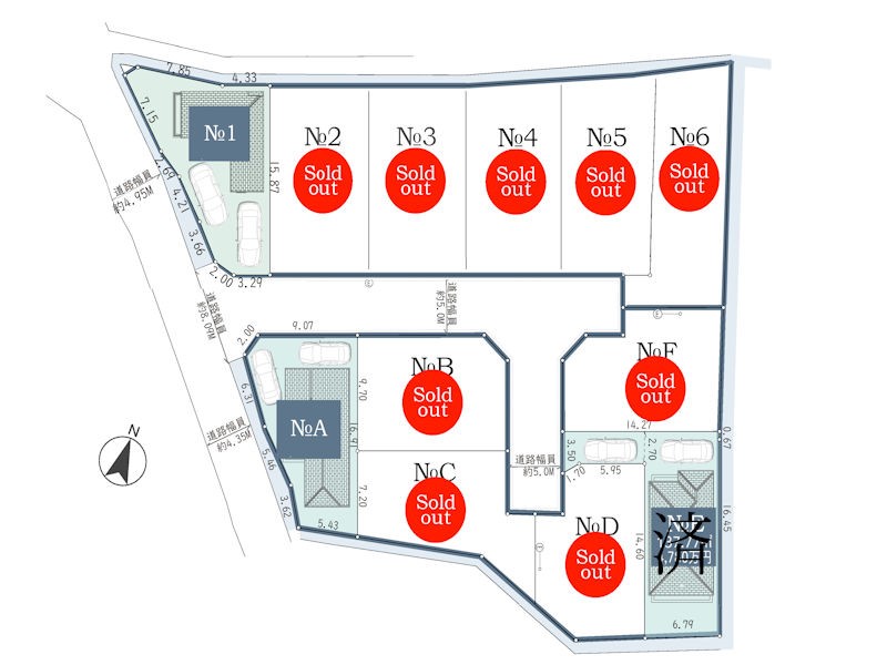 | 駐車場 | 2台 | 道路の幅員 | A号棟:北西5m /1号棟:南東5m |