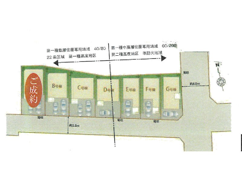 | 駐車場 | 2台 | 道路の幅員 | C号棟:南5m /F号棟:南5m /E号棟:南5m /D号棟:南5m /G号棟:南5m 東8m /B号棟:南5m |