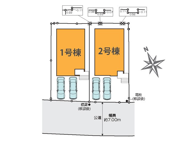 | 駐車場 | 2台 | 道路の幅員 | 1号棟:南西6.9m /2号棟:南西6.9m |