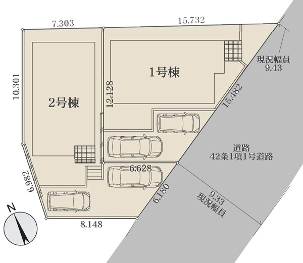 | 駐車場 | 2台 | 道路の幅員 | 1号棟:南東9.3m /2号棟:南東9.3m |