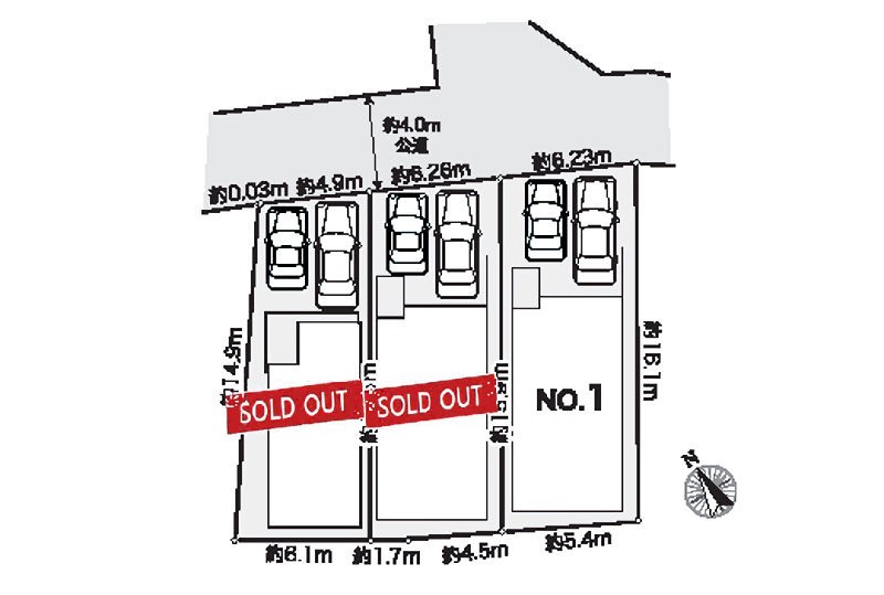 | 駐車場 | 2台 | 道路の幅員 | 1号棟:北東4m |