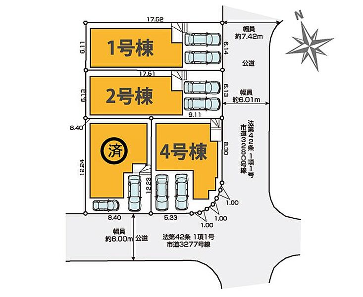| 駐車場 | 2台 | 道路の幅員 | 4号棟:南東6m 南西6m /1号棟:南東6m /2号棟:南東6m |