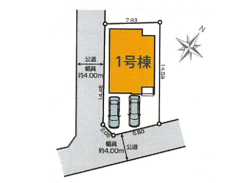 | 駐車場 | 2台 | 道路の幅員 | 1号棟:南東4m 南西4m |