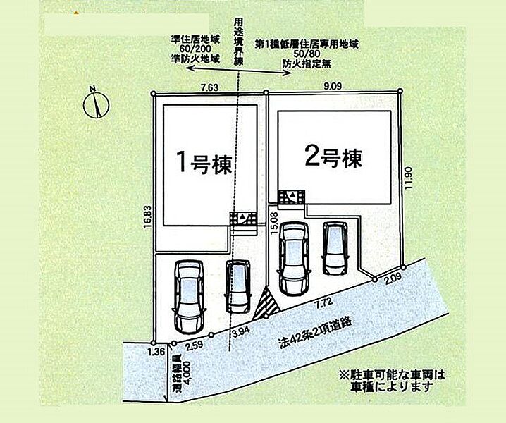 | 駐車場 | 2台 | 道路の幅員 | 2号棟:南4m /1号棟:南4m |
