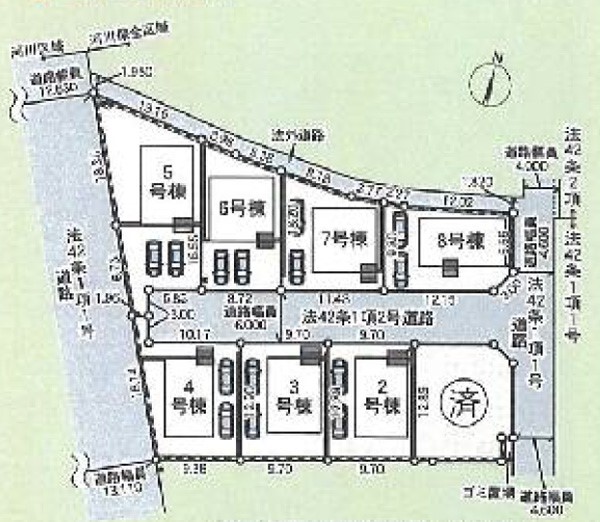 | 駐車場 | 2台 | 道路の幅員 | 5号棟:南6m 西12.6m /8号棟:南6m 東4.6m /7号棟:南6m /6号棟:南6m |