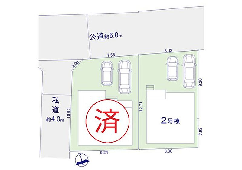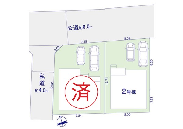 | 駐車場 | 2台 | 道路の幅員 | 2号棟:北東6m |