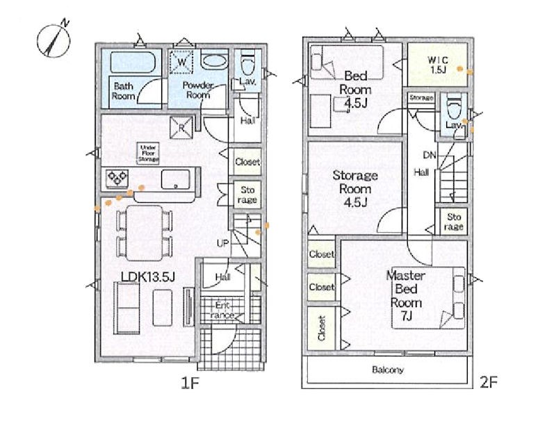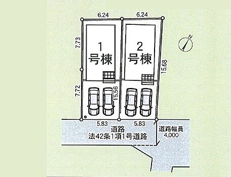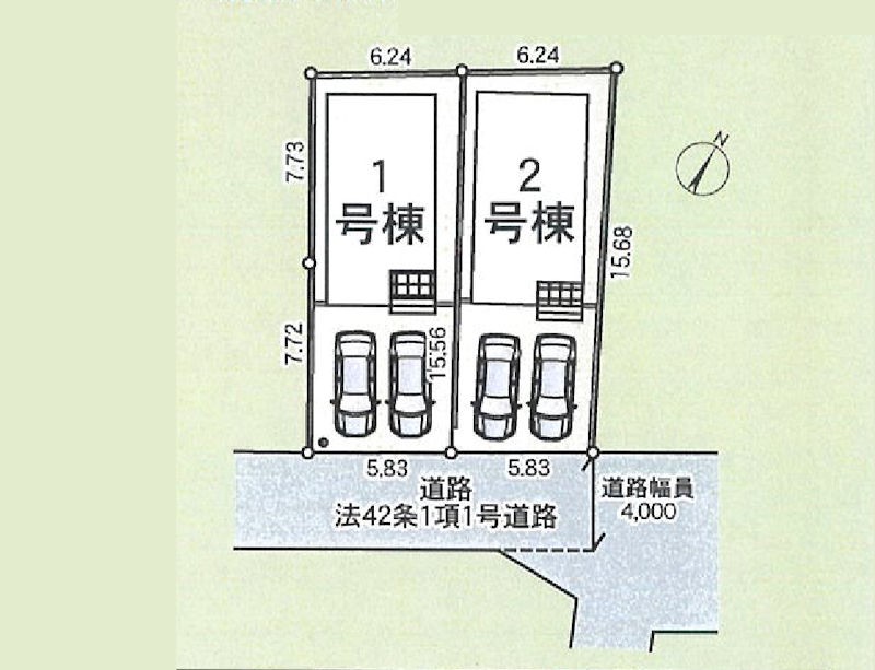 | 駐車場 | 2台 | 道路の幅員 | 1号棟:南東4m /2号棟:南東4m |