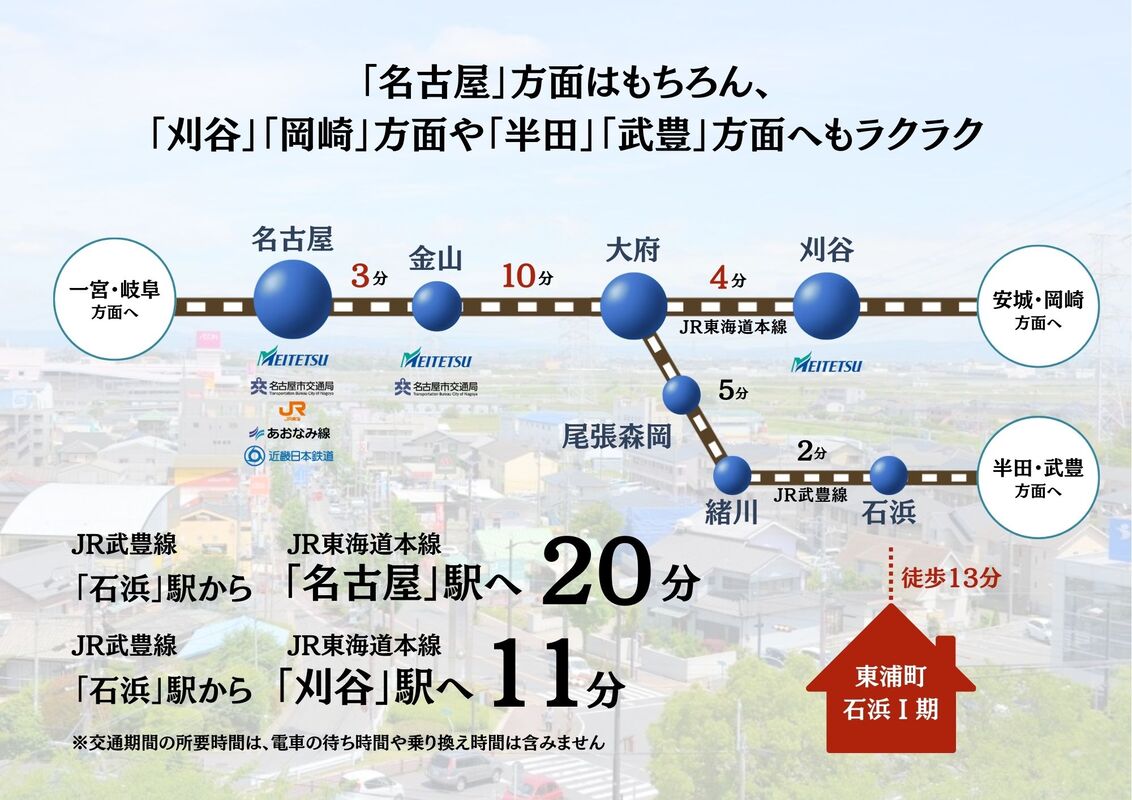 JR武豊線石浜駅まで徒歩13分(1000m)。片葩小学校まで徒歩6分。主要道路へもアクセスしやい利便性と穏やかさが調和した、魅力的なエリア