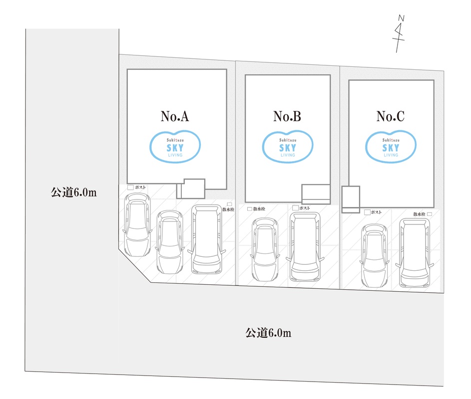 | 駐車場 | 2台 ~ 3台(2台(2戸)・3台(1戸)) | 道路の幅員 | 道路幅:6m、アスファルト舗装、南側幅員6.0m、西側幅員6.0m |