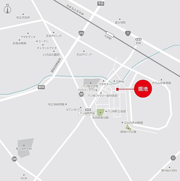 名鉄名古屋本線「牛田」駅 徒歩10分 JR東海道本線「東刈谷」駅 車2.8km 知立市コミュニティバス「八ツ田小学校」 徒歩5分 |
