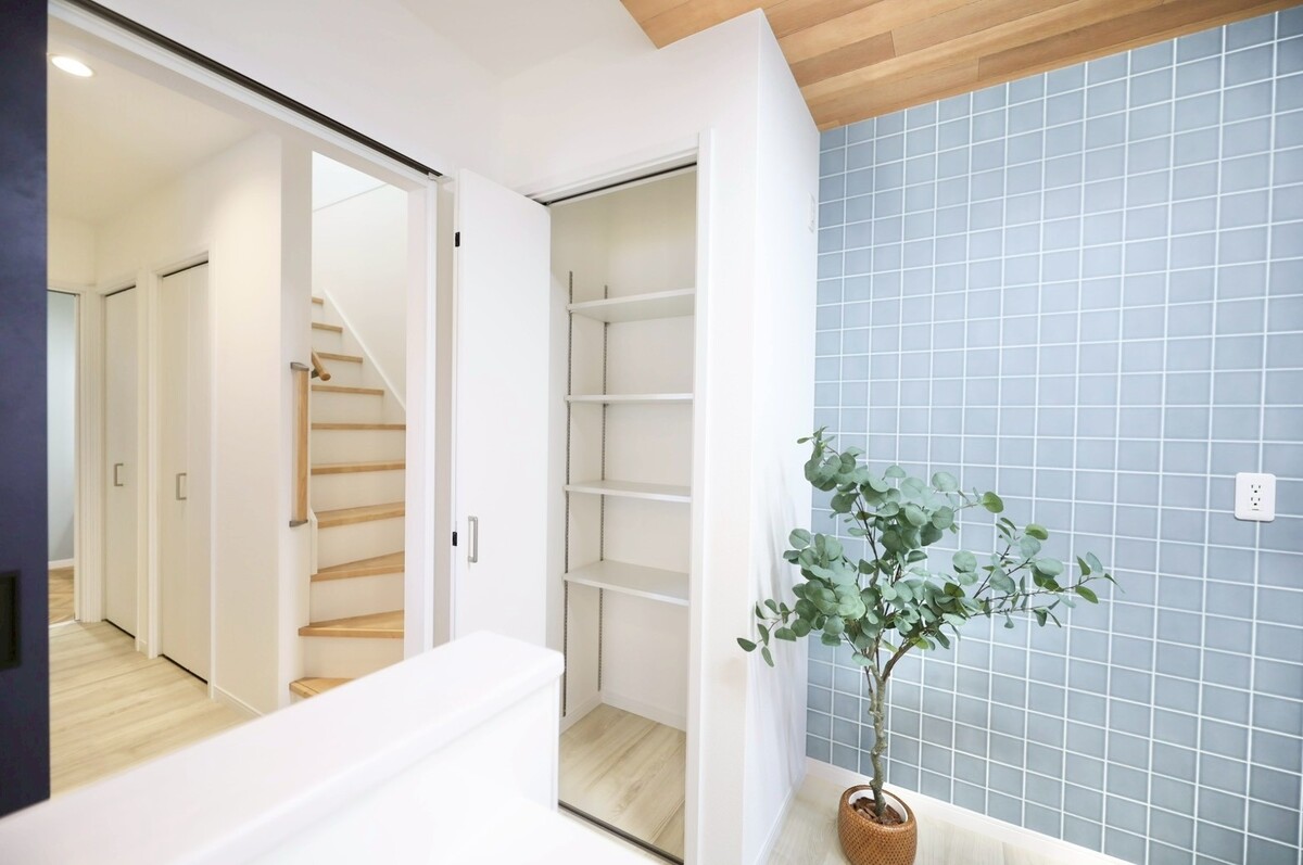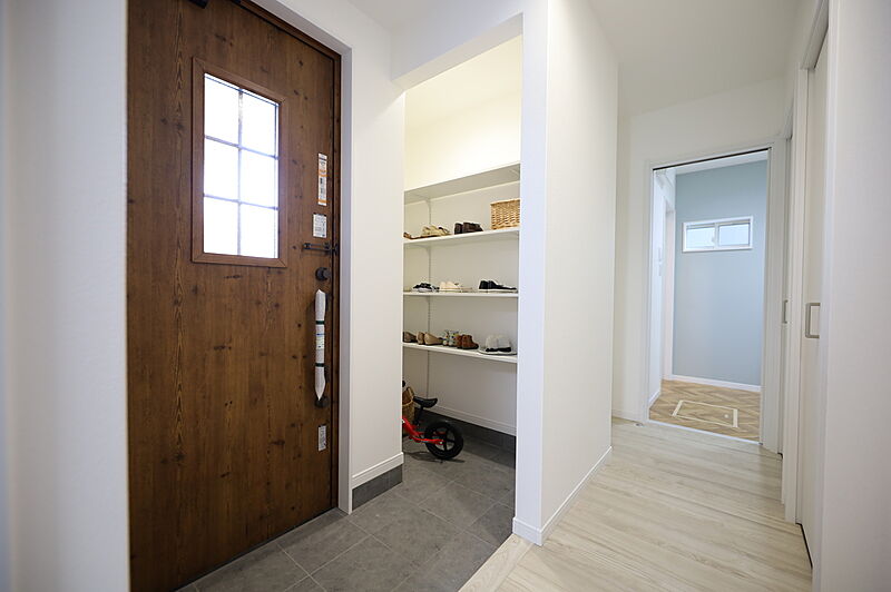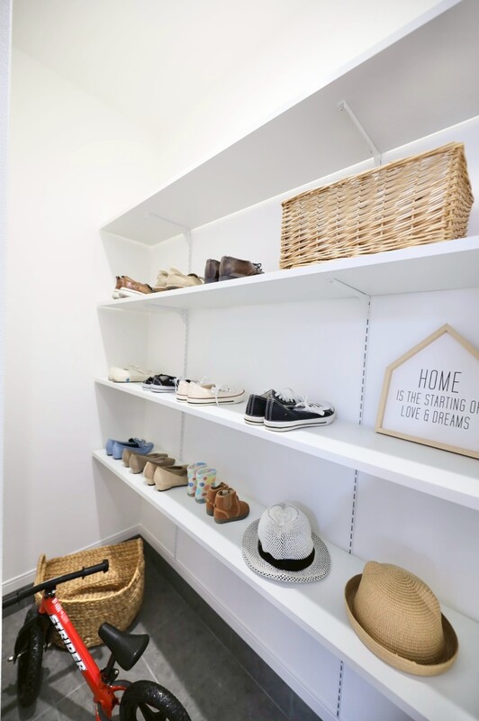 余裕のある玄関ホールに大容量土間収納でいつでもきれいな玄関。その他パントリー、ウォークインクローゼットなど大きな収納はもちろん、適材適所に収納が置かれているため、片付けもしやすくスッキリ整えることができます。