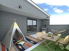 広めのバルコニーと軒で、心地よい日差しと開放感を確保。アウトドアリビングとして家族や友人と過ごしたり、趣味やリラックスタイムに使ったり、自由に楽しめる空間が、日常に彩りを添えます。