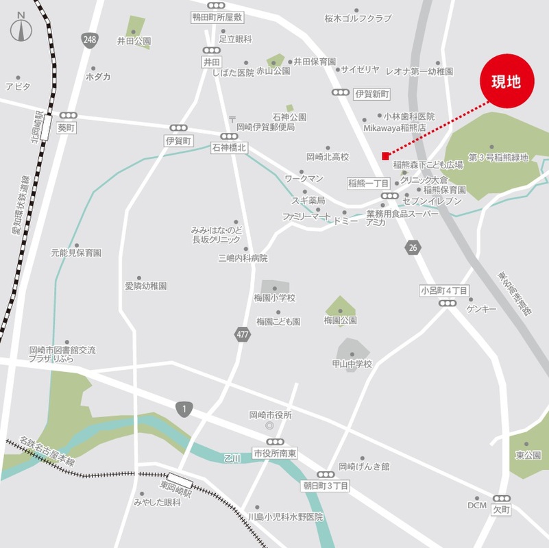 - 名鉄名古屋本線「東岡崎」駅 車で4km/自転車16分愛知環状鉄道「北岡崎」駅 車で2.9km/自転車12分名鉄バス「岡崎北高東門前」 徒歩4分
