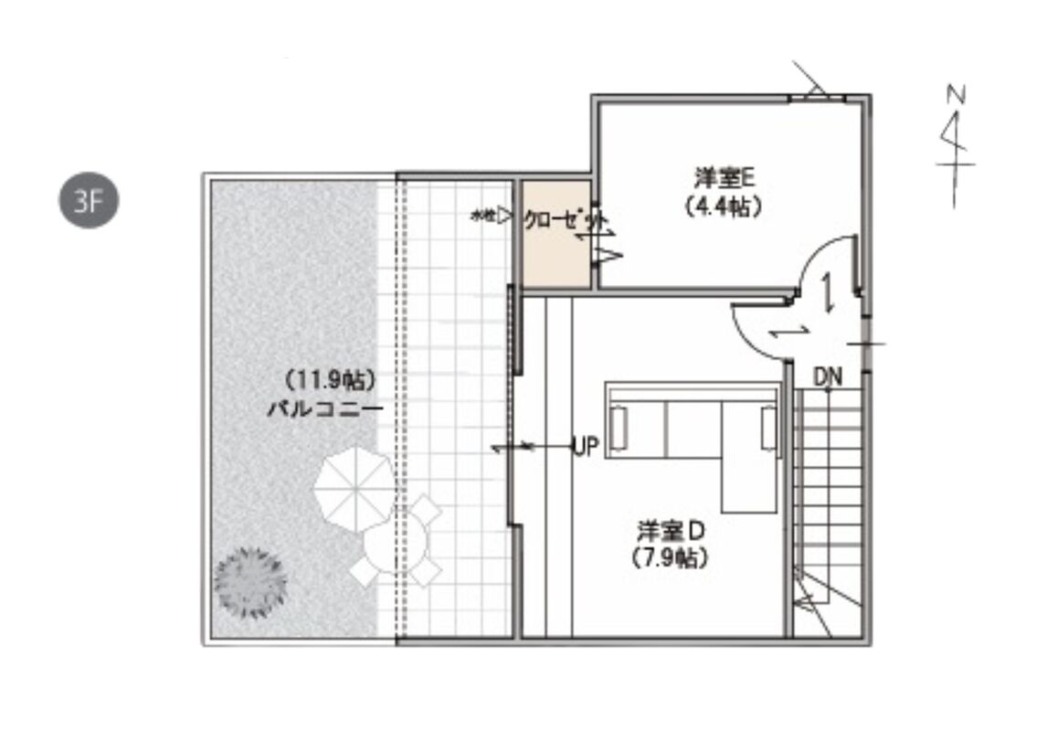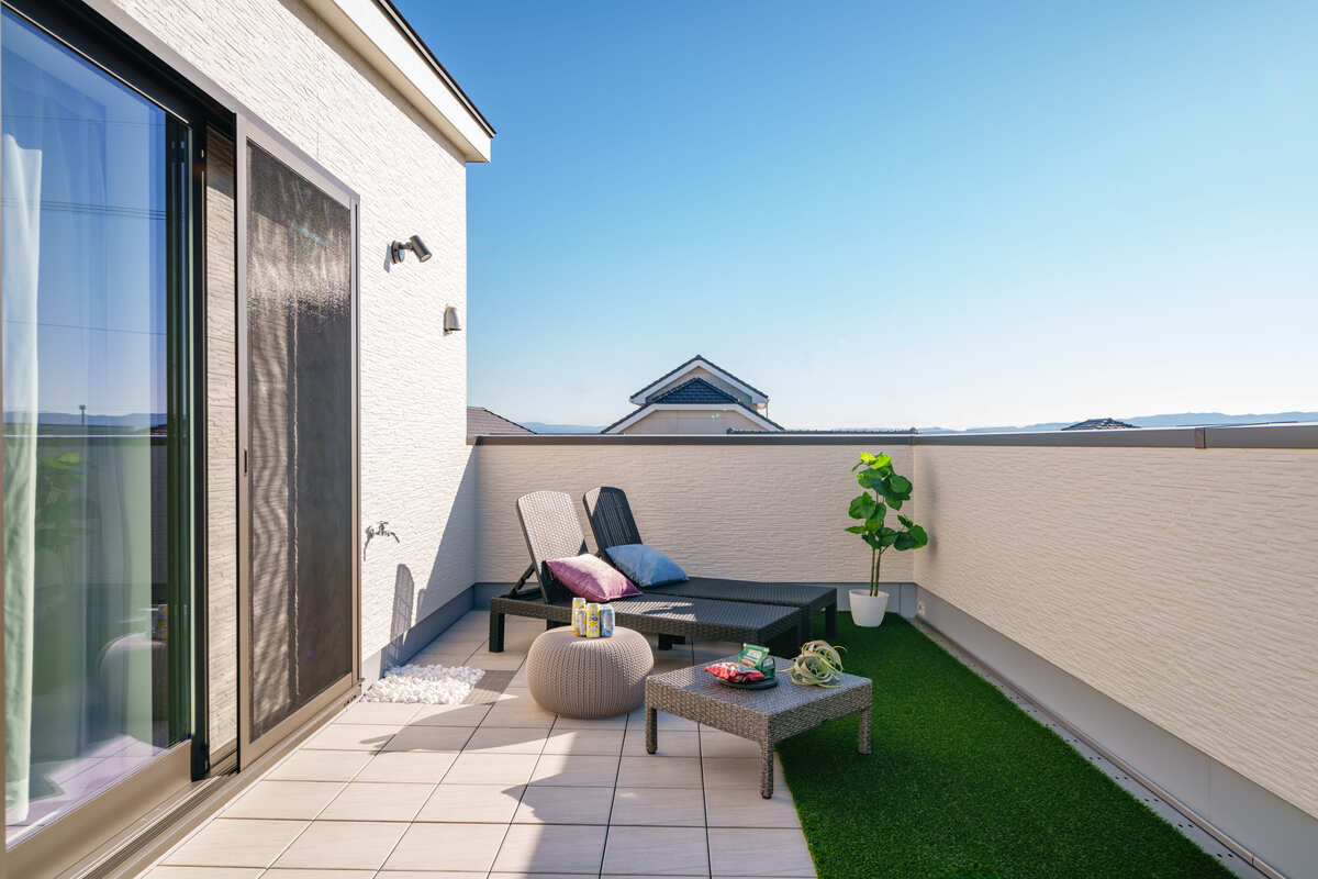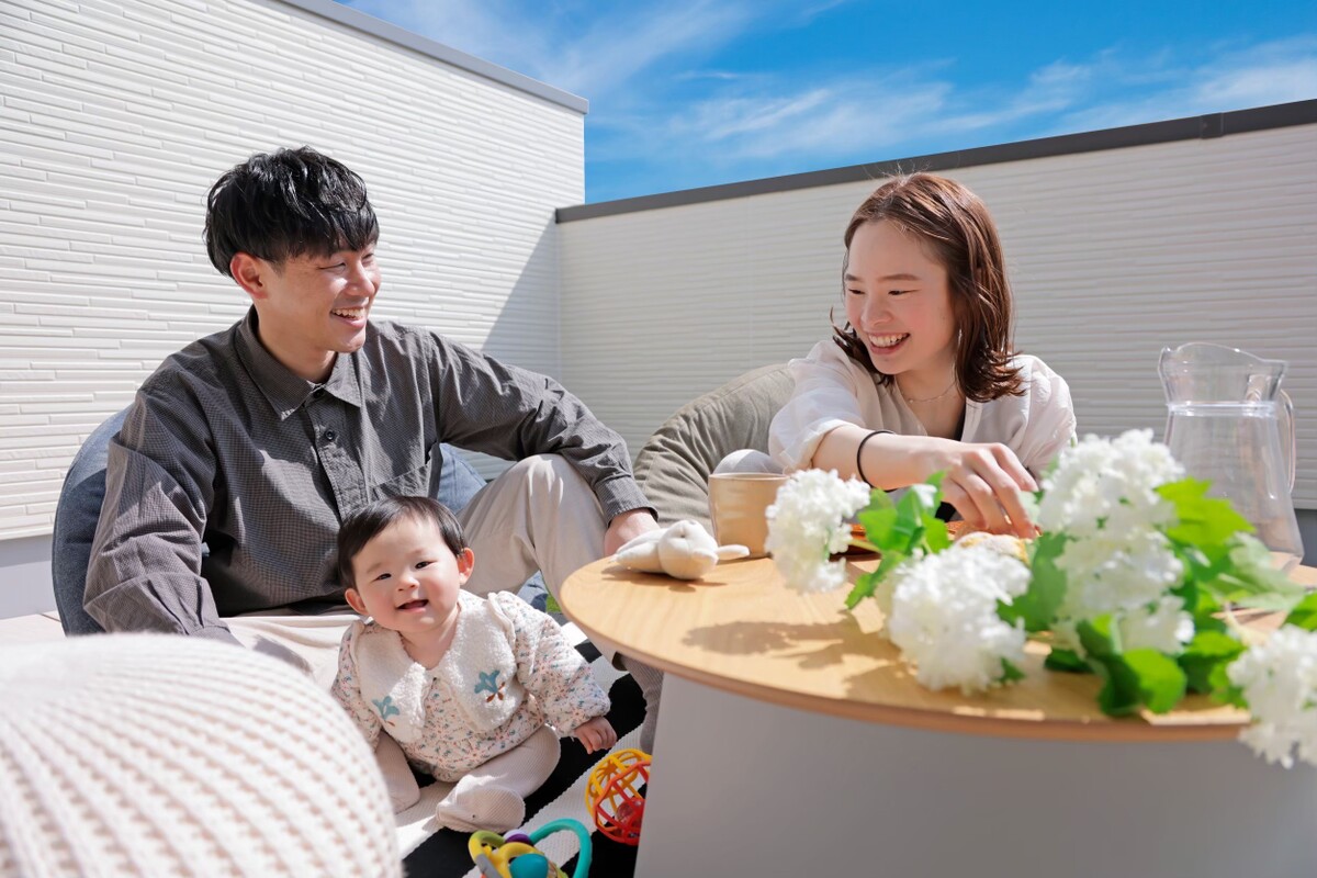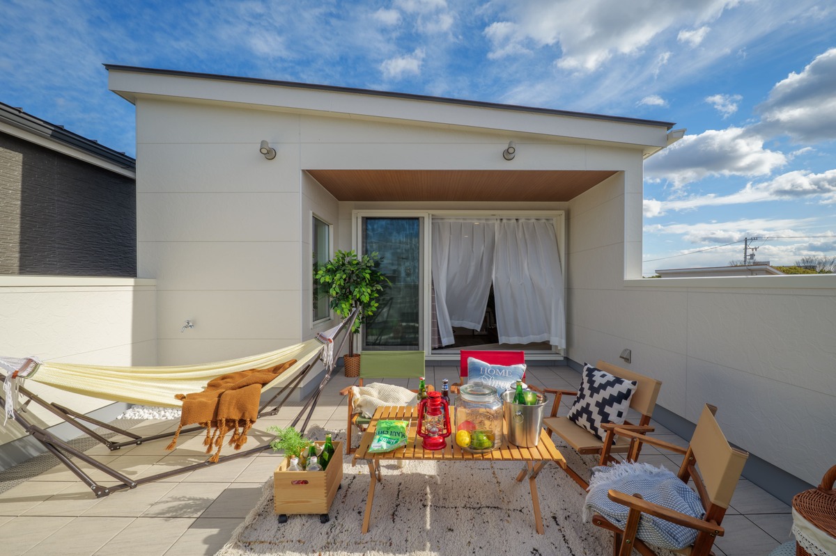 広めのバルコニーと軒で、心地よい日差しと開放感を確保。アウトドアリビングとして家族や友人と過ごしたり、趣味やリラックスタイムに使ったり、自由に楽しめる空間が、日常に彩りを添えます。