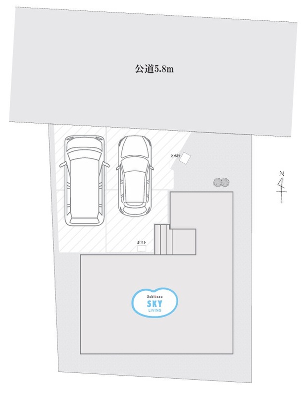 | 駐車場 | 2台 | 道路の幅員 | 道路幅:5.8m、アスファルト舗装、北側幅員 |