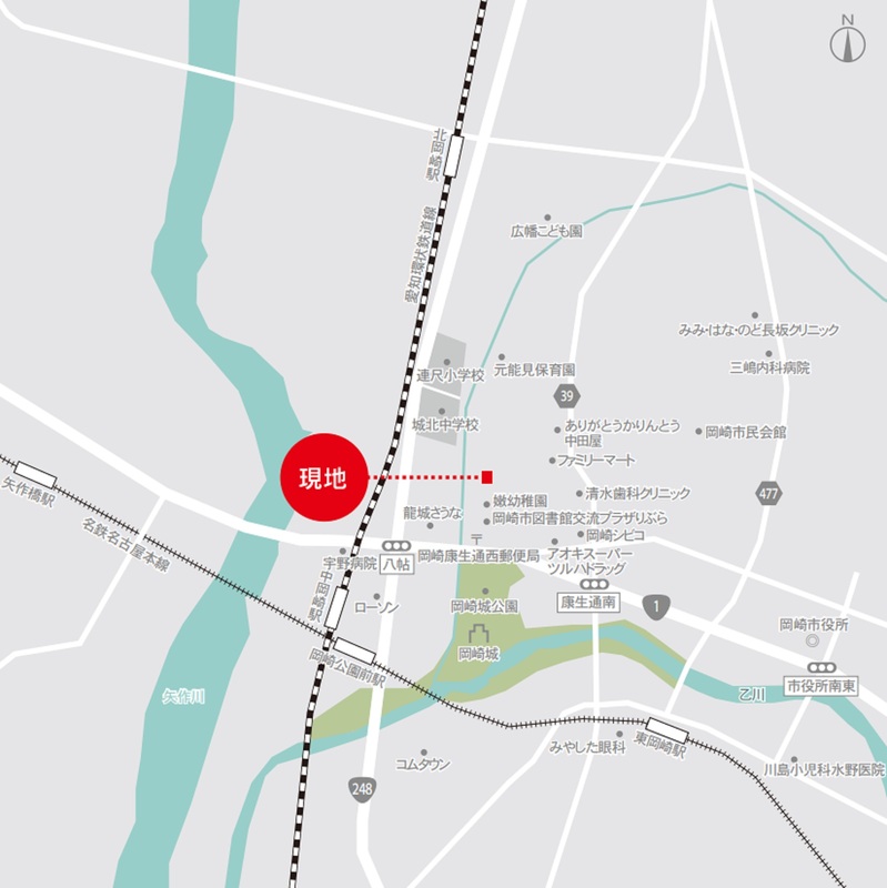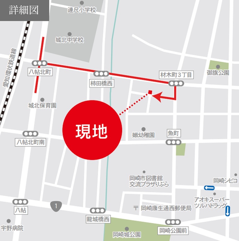 - 名鉄名古屋本線「東岡崎」駅 車で1.5km/自転車6分愛知環状鉄道「中岡崎」駅 車で1.2km/自転車5分名鉄バス「岡崎公園門前」 徒歩7分