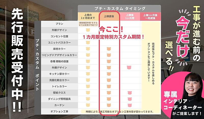 ■来場特典 事前予約+事前アンケート回答+店舗来場をしていただいた方に、「2000円分のギフトカード」をプレゼント! ■成約特典 春の新生活応援サービス! 【全物件対象】90種類から選べる暮らしに使える商品プレゼント! 【限定物件(1)】コーディネーターが選んだ家具そのままプレゼント! 【限定物件(2)】追加工事10万円サポート! ※詳細や適用条件は、当社ホームページまたはスタッフまで。 |