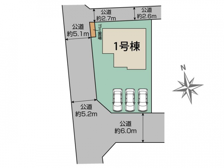 | 駐車場 | 3台 | 道路の幅員 | 南6.0m、西5.1~5.2、北2.6~2.7m 公道 |