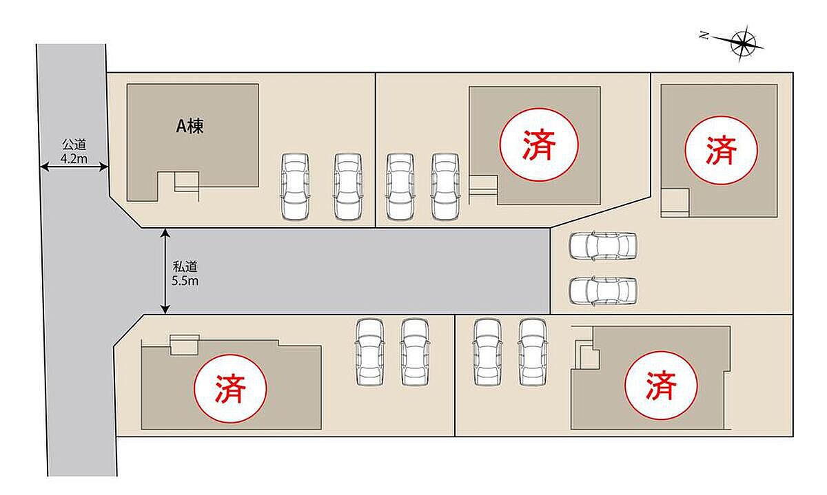 | 駐車場 | 2台 | 道路の幅員 | 道路幅:4.2m・5.5m、アスファルト舗装 |