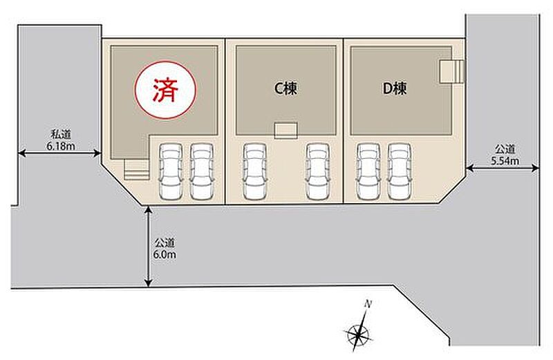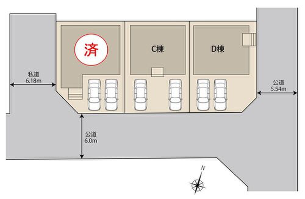 | 駐車場 | 2台 | 道路の幅員 | 道路幅:5.5m~6.1m、アスファルト舗装、私道87m2 持分1/4(B棟) |