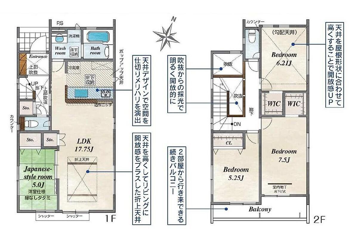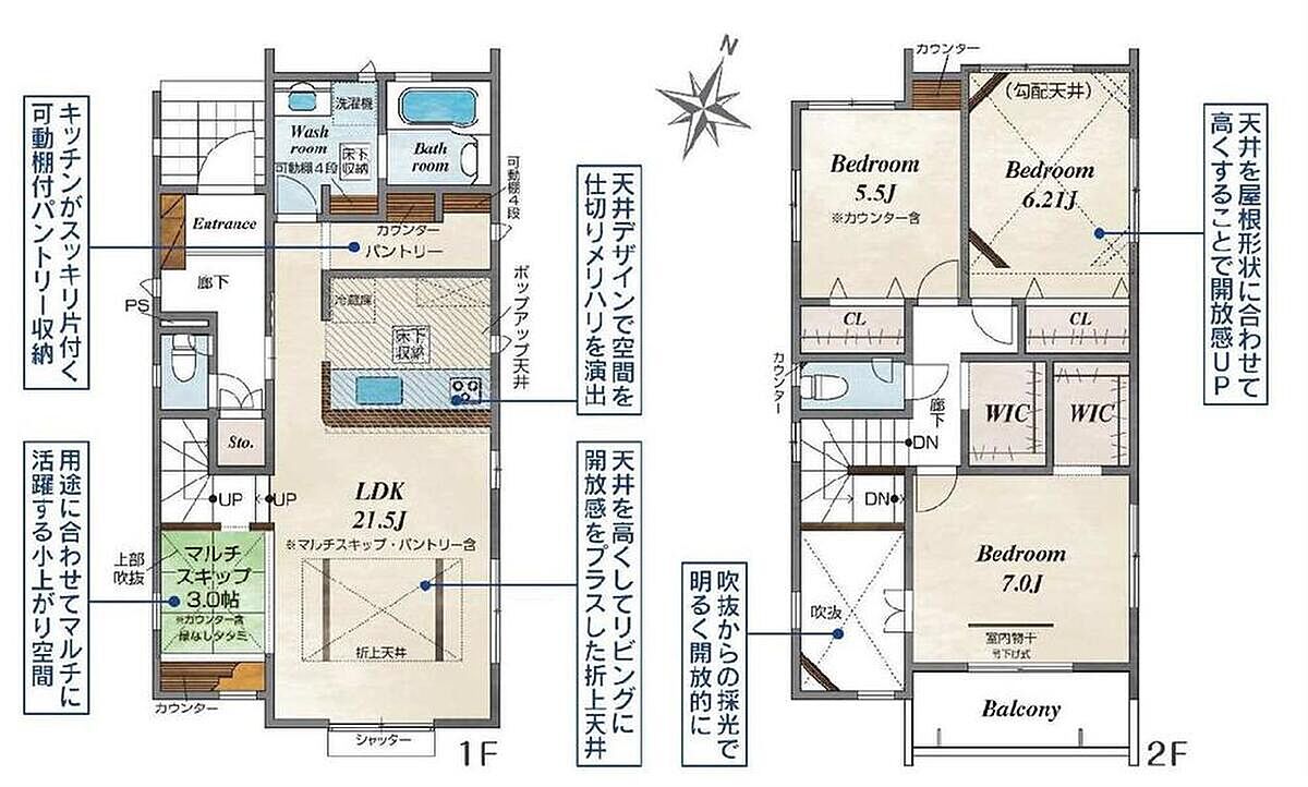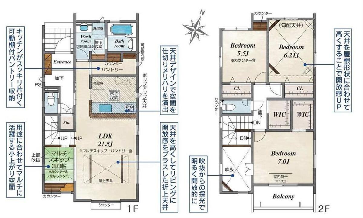 ≪内覧希望・資料請求などお気軽にご相談下さい≫ 折上天井の開放的なリビング♪ 便利な和室あり!全居室収納スペース付き!