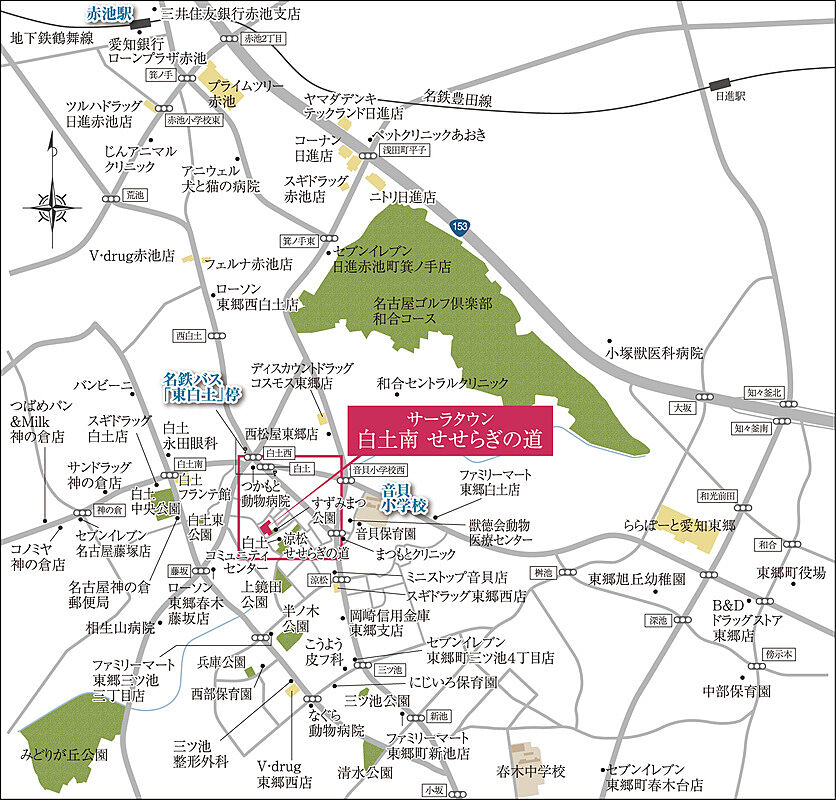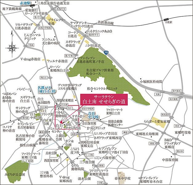名古屋市営鶴舞線「赤池」駅 バス10分 名鉄「東白土」停 徒歩8分~9分 名鉄豊田線「赤池」駅 徒歩34分~35分 |