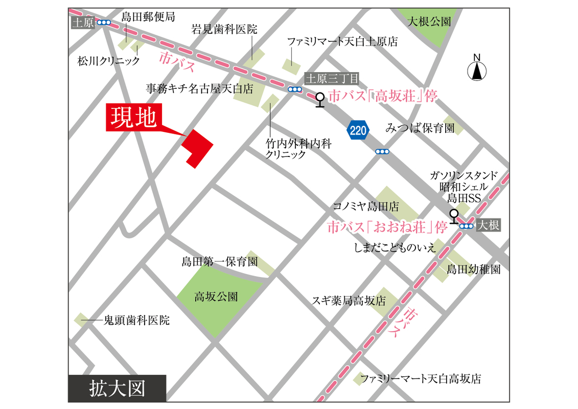 車・交通 地下鉄桜通線【相生山】駅 (1760m 自転車で10分、徒歩8分の「おおね荘停」からバスで7分)