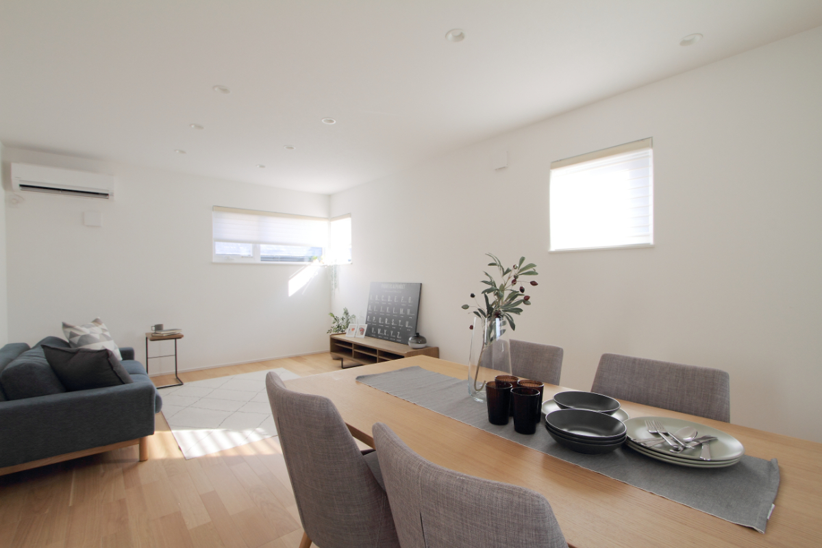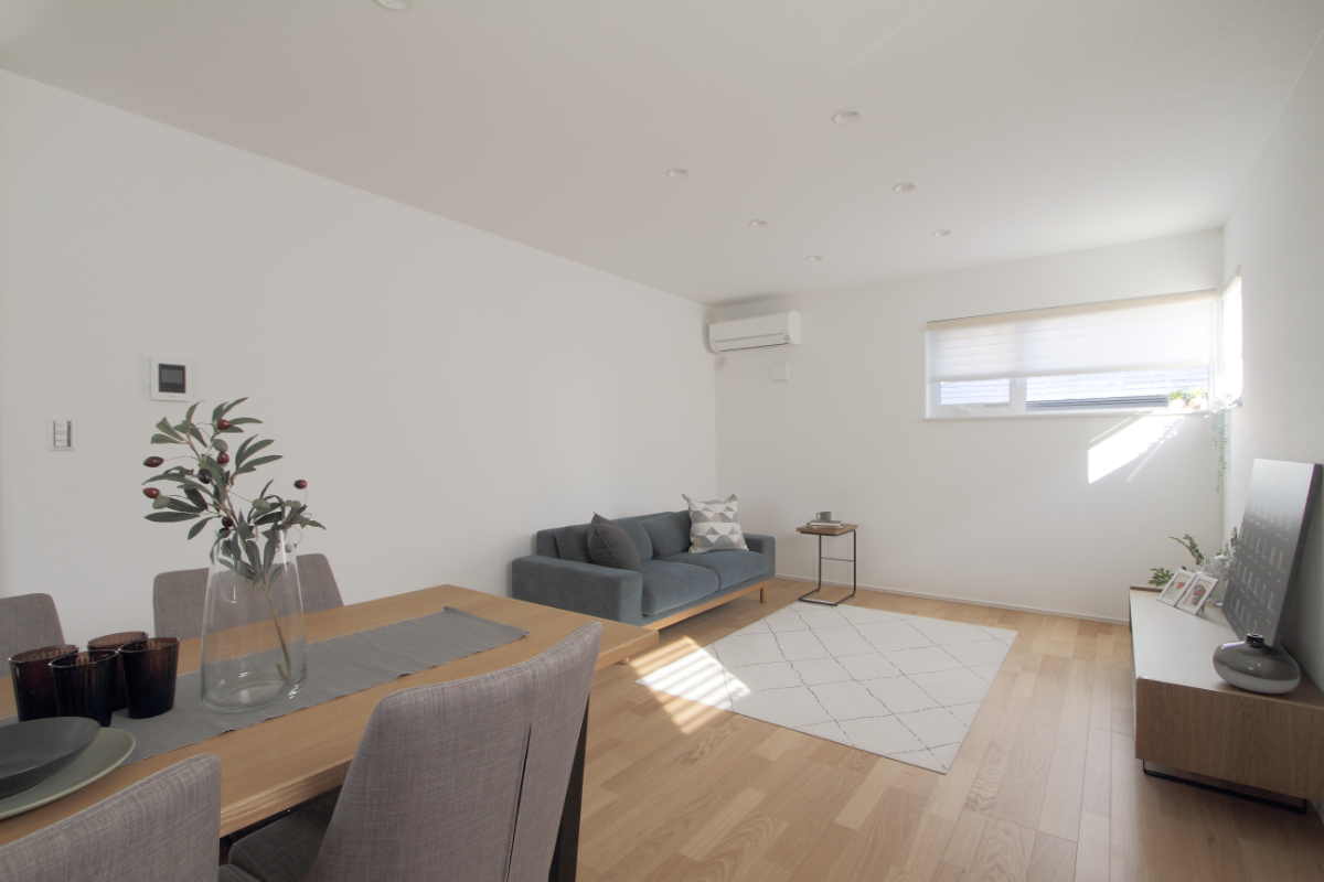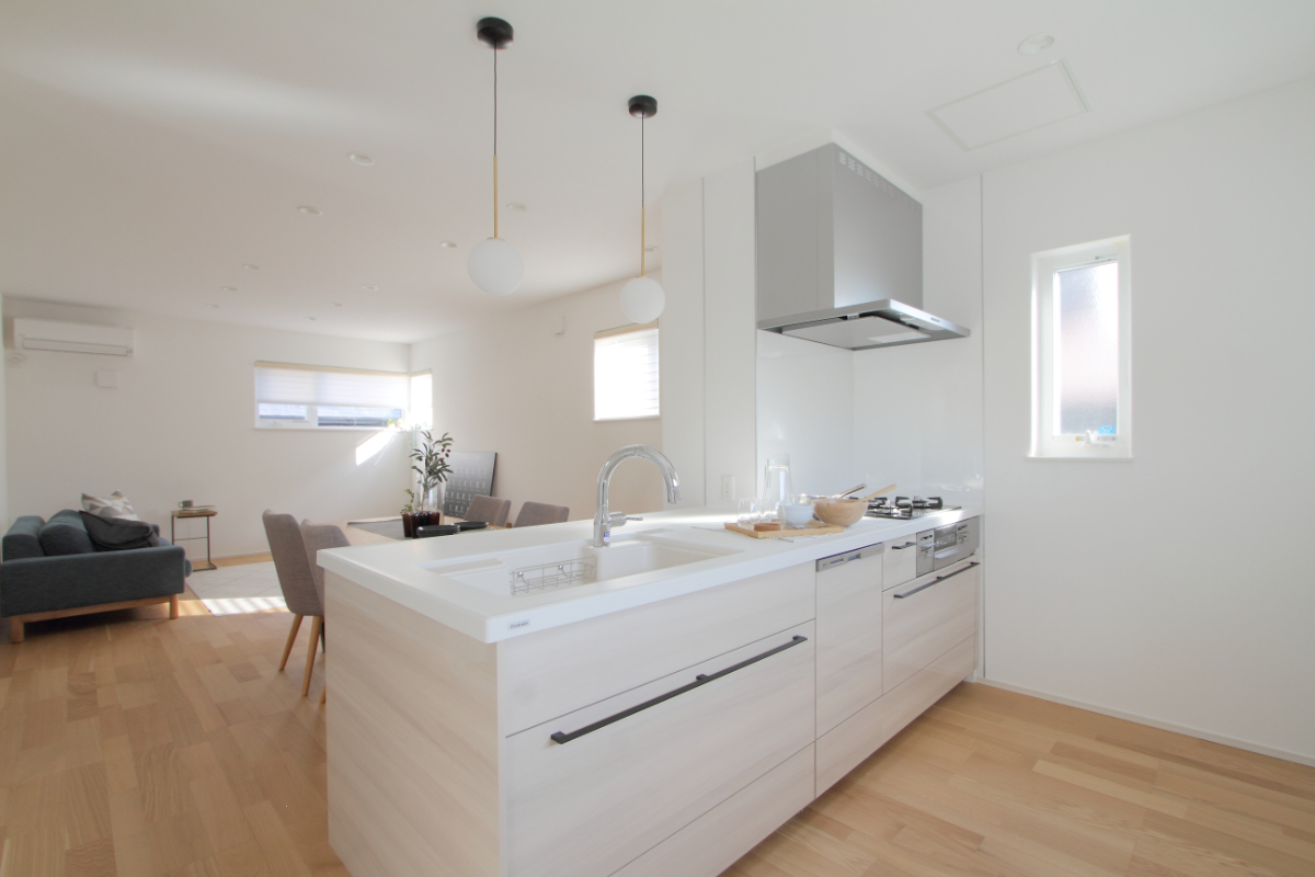 収納スペースを多く確保し、オープンなリビング・ダイニング・キッチンの配置を取り入れることで、居住空間が広く感じられるように工夫されています。