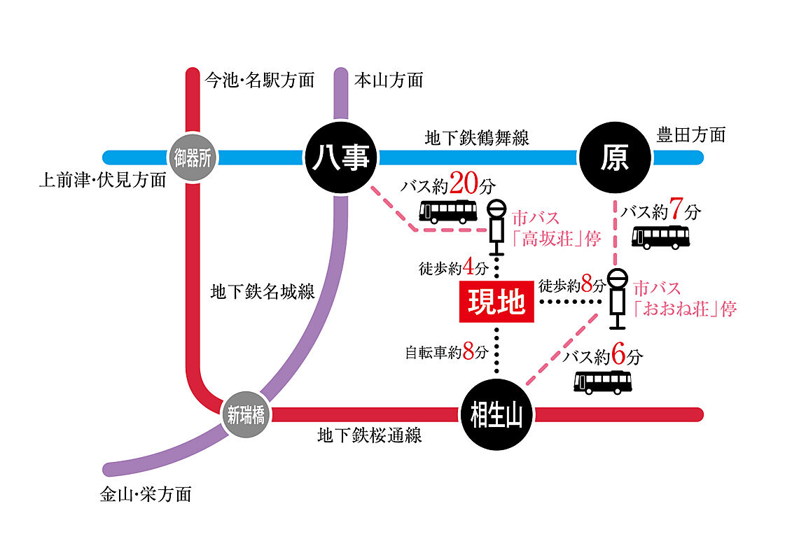 名古屋市営名城線「八事」駅 市バス6分「高坂荘」バス停 徒歩4分 名古屋市営鶴舞線「原」駅 市バス7分「おおね荘」バス停 徒歩8分 名古屋市営桜通線「相生山」駅 徒歩22分 |