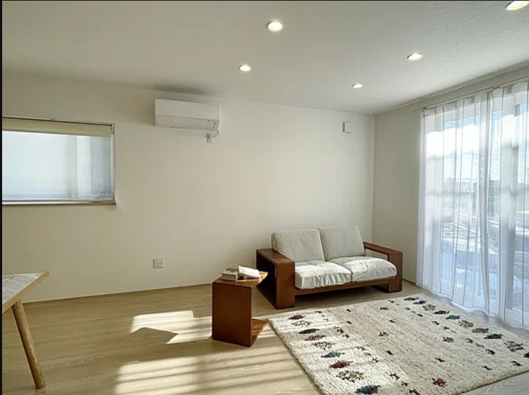 18.1帖の広々としたリビング。1階にカーテンとリビングエアコ...