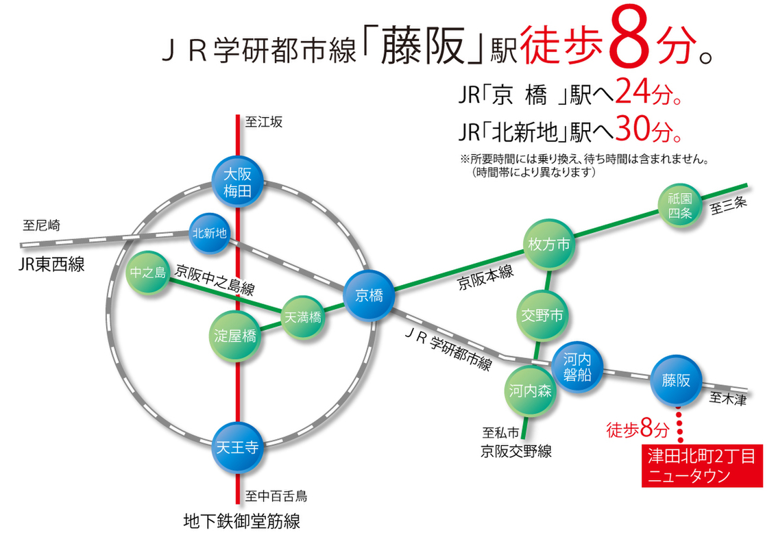JR学研都市線 藤坂駅まで徒歩8分。大阪都心部まで約30分で快適にアクセス可能な立地
