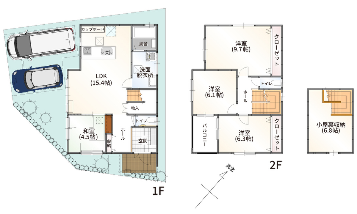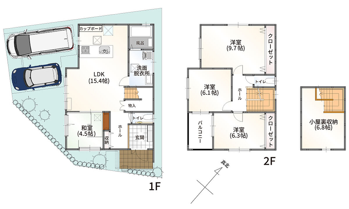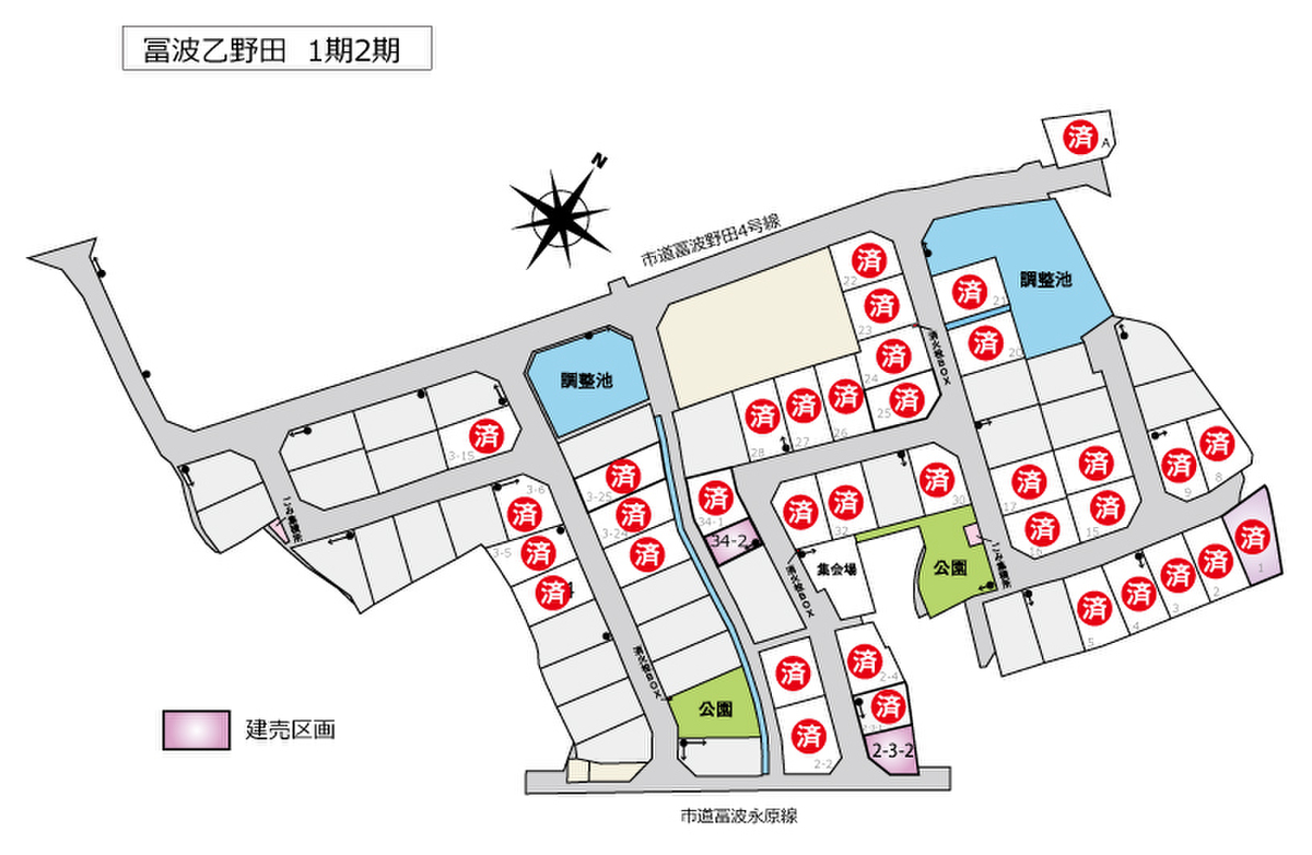 | 間取り | 2-3-2号地:4LDK+小屋裏収納(固定階段付)、34-2号地:3LDK+フリールーム+小屋裏収納(固定階段付) | 建物構造 | 木造二階建て |