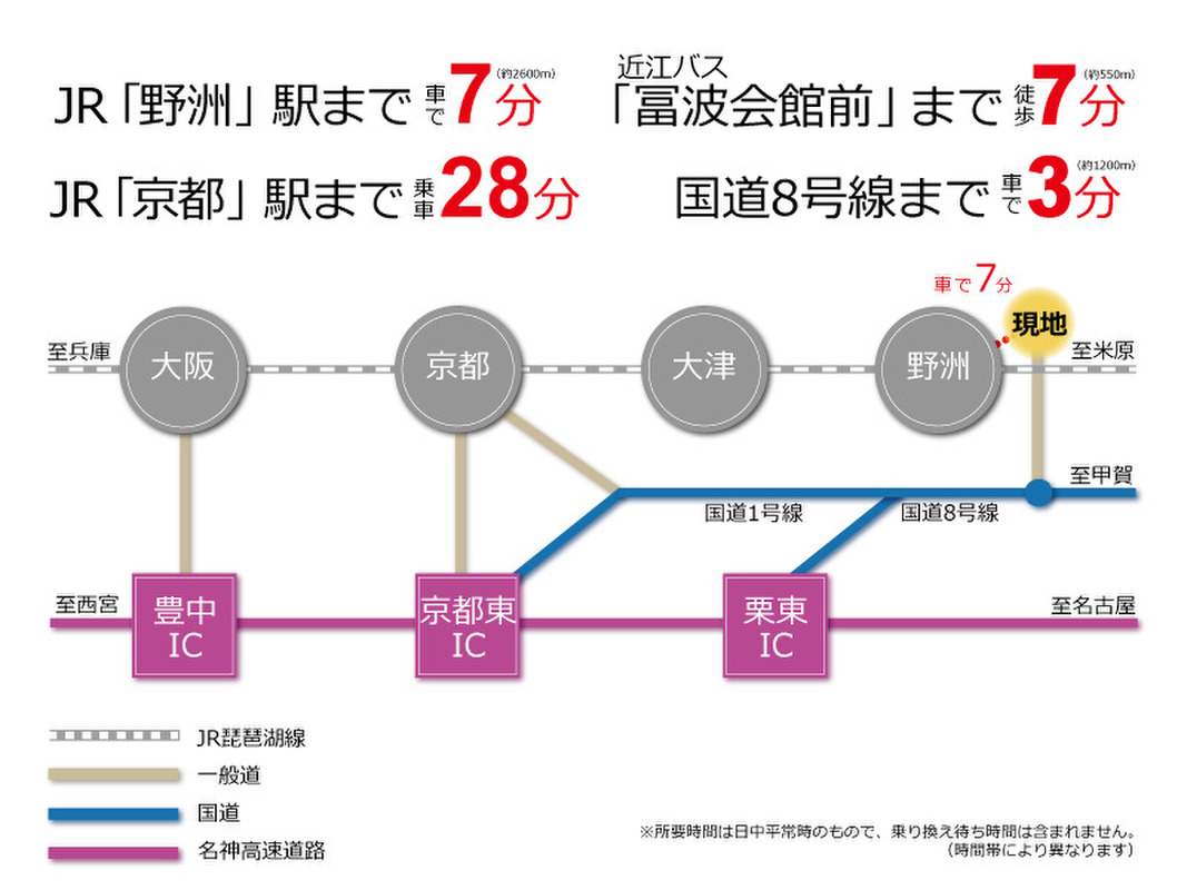 - JR東海道・山陽本線「野洲」駅 車で約7分バス 徒歩7分