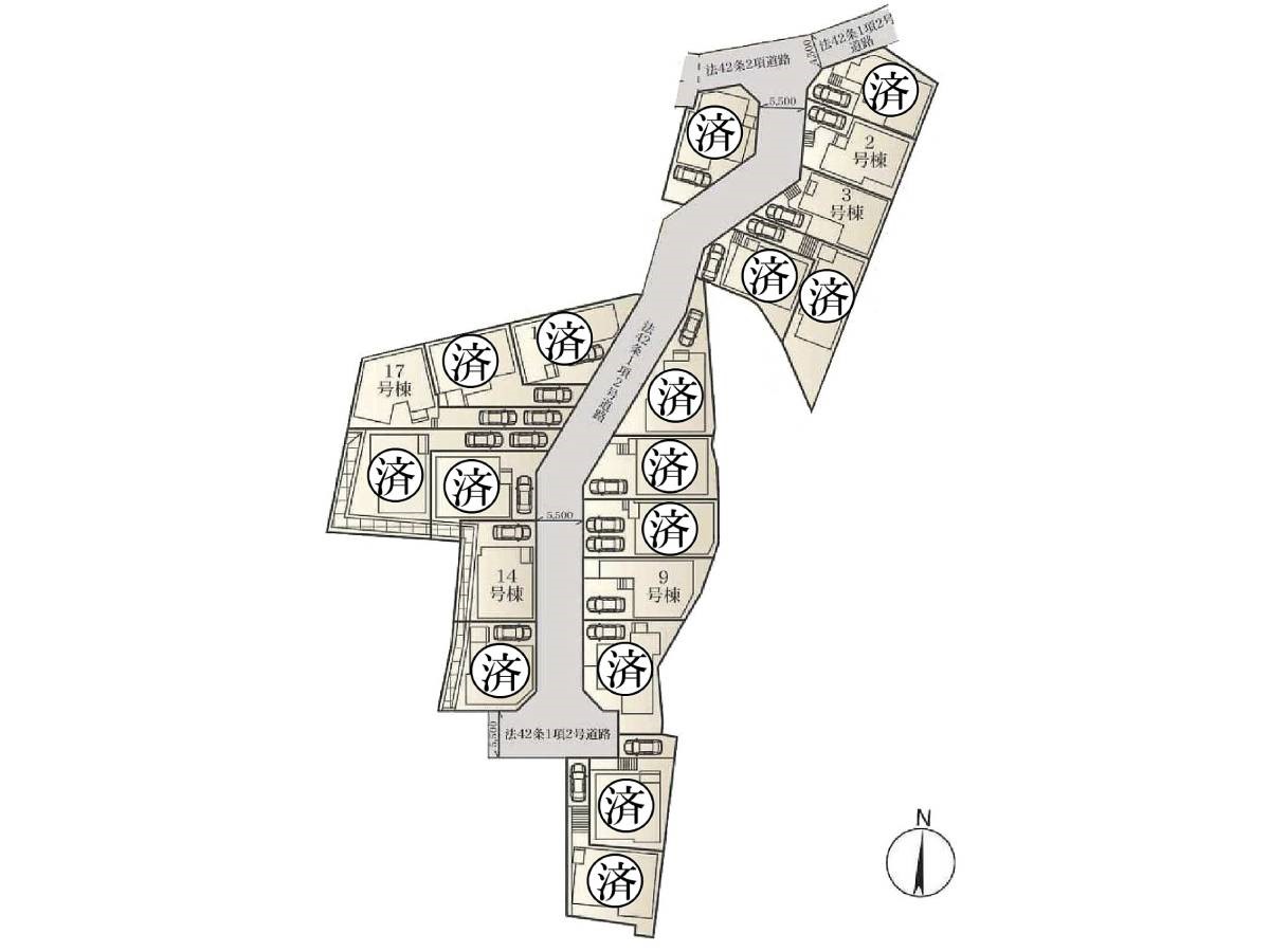 | 駐車場 | 1台 ~ 2台 | 道路の幅員 | 8号棟:西5.5m/17号棟:東5.5m/2号棟:北西5.5m/9号棟:西5.5m |