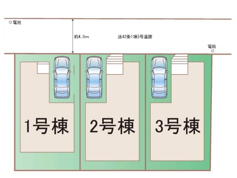 | 駐車場 | 1台 | 道路の幅員 | 1号棟:北4m/3号棟:北4m/2号棟:北4m |