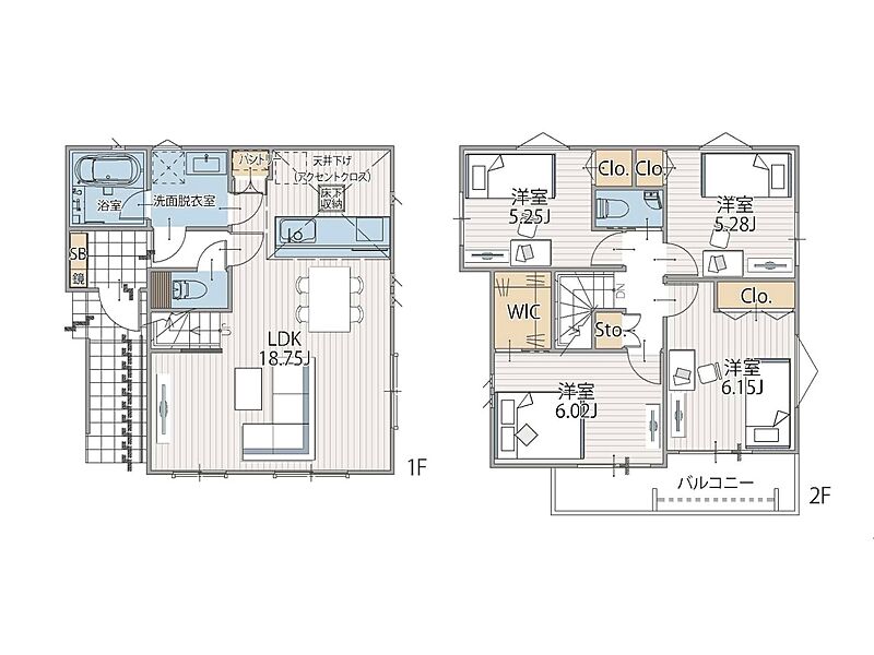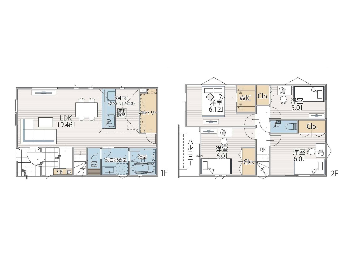 ◆1階リビング+2階は洋室4部屋の2階建住宅 WICやパントリーなど豊富な収納スペース付き