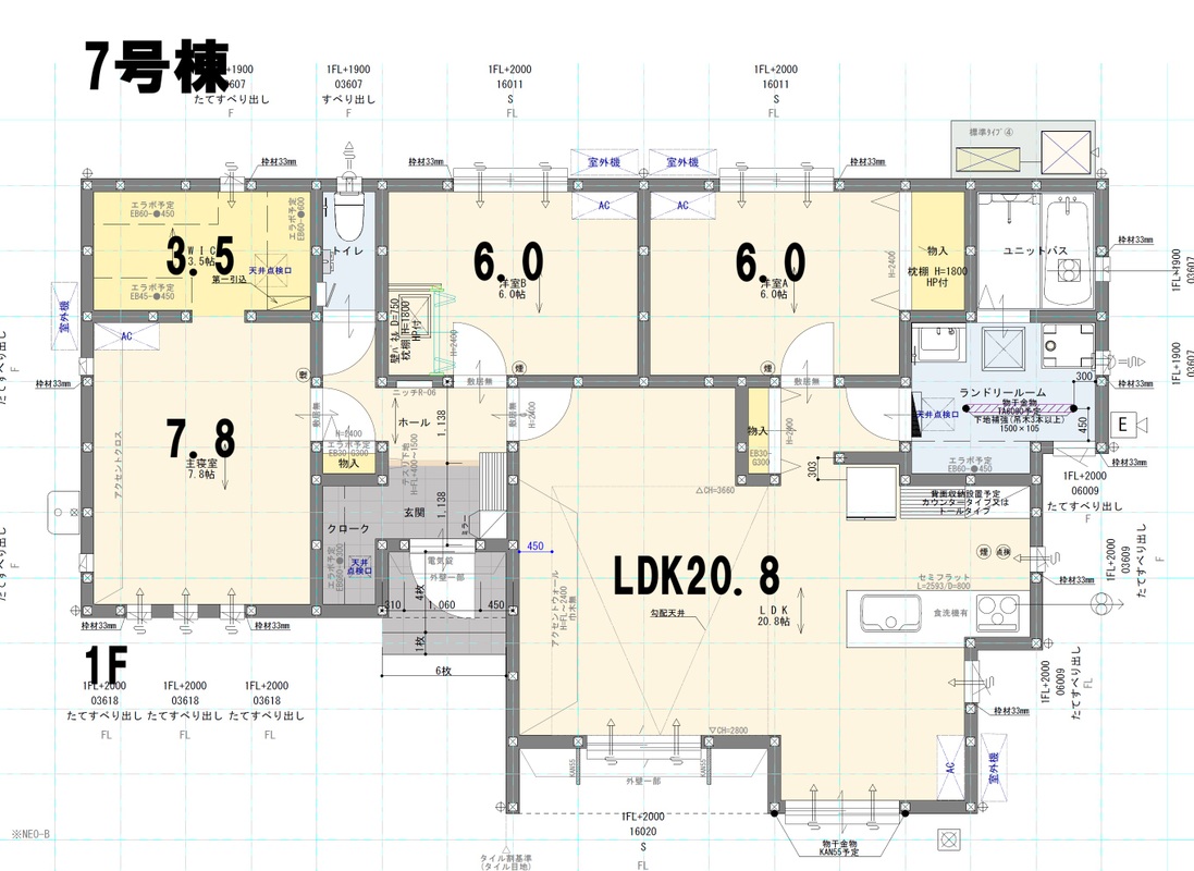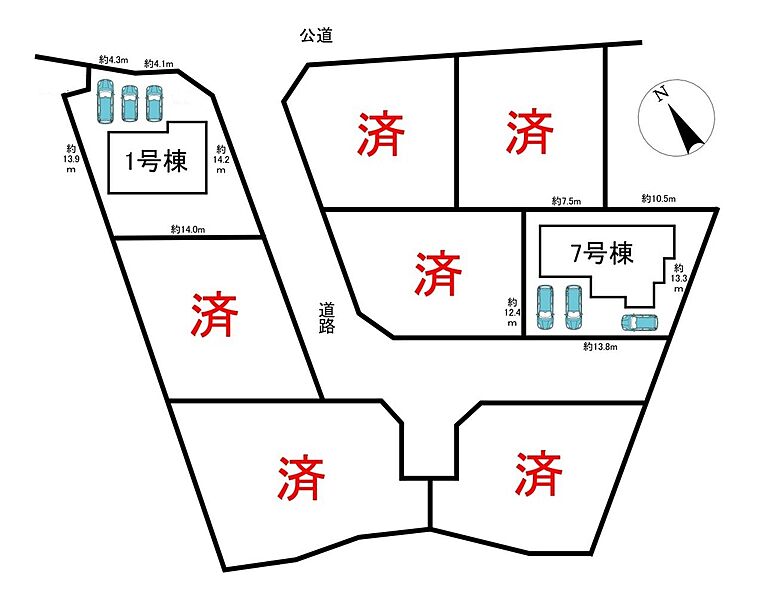 | 建物面積 | 94.20m2(7区画)~104.35m2(1区画) | 土地面積 | 201.54m2(7区画)~210.57m2(1区画) |
