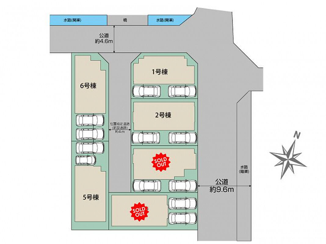 | 駐車場 | 2台 | 道路の幅員 | 北東9.6m公道、北西4.6m公道、位置指定道路4.0m(新設道路) |