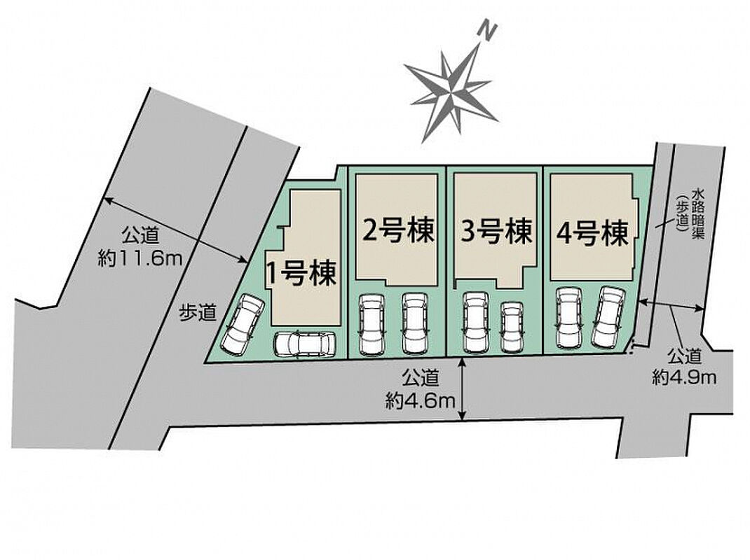 | 駐車場 | 2台 | 道路の幅員 | 南西側11.6m、北東側4.9m、南東側4.6m |
