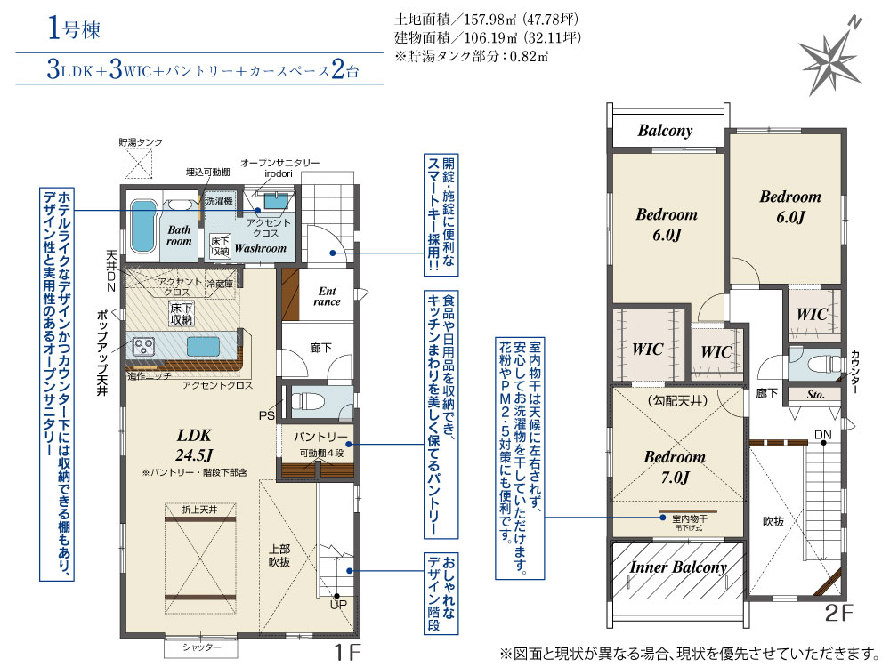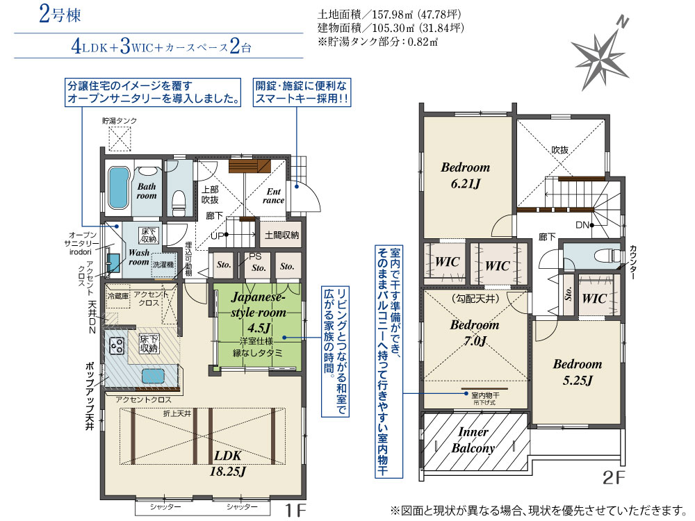 | 建物面積 | 105.30m2(約31.85坪)~110.95m2(約33.56坪) | 土地面積 | 157.98m2(約47.78坪) |