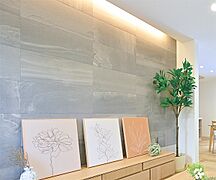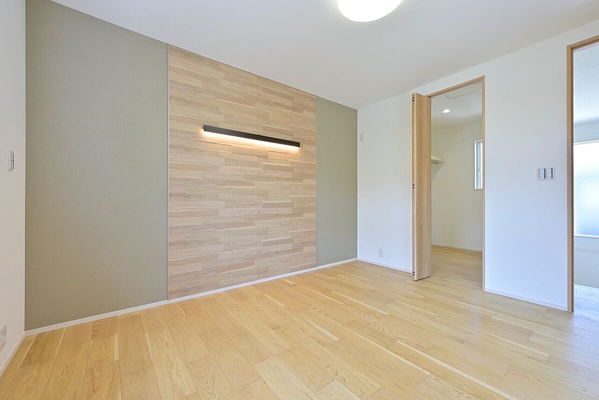【アクセントウォール・間接照明】深みのある素材に柔らかな光が陰影を添え、上質さを演出。