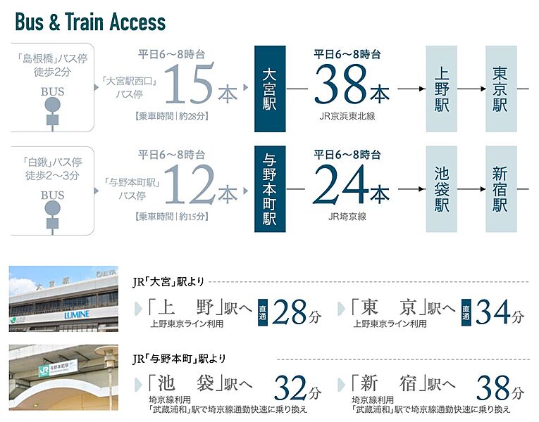 JR高崎線「大宮」駅 バス乗車28分、西武バス/島根橋バス停下車 徒歩2分 JR埼京線「与野本町」駅 バス乗車15分、国際興業バス/白鍬バス停下車 徒歩3分 |