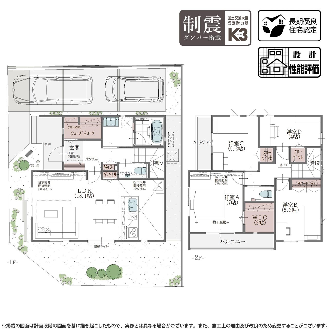 国土交通大臣認定耐力壁「K3」制震ダンパー搭載 / 調湿・脱臭効果を発揮する機能性建材「エコカラットプラス」採用 / ZEH水準適合の断熱・省エネルギー性能×オール電化住宅