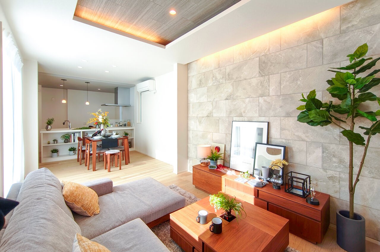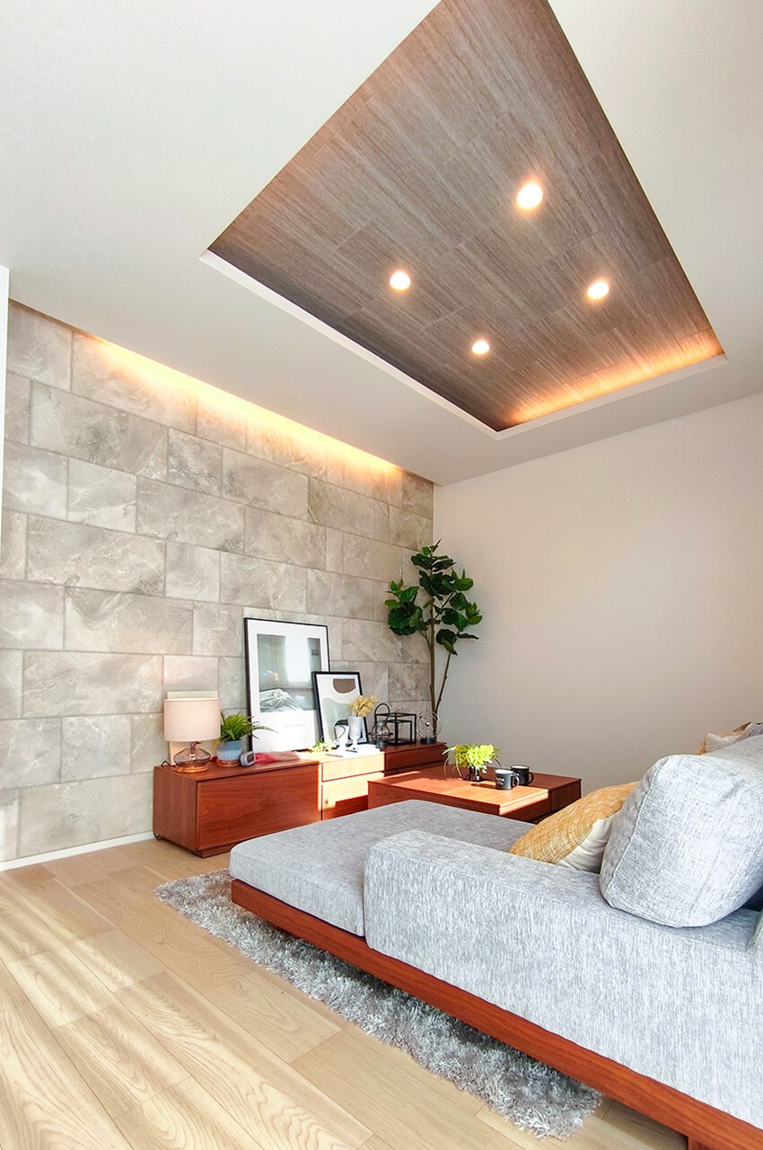 【アクセントウォール・間接照明】深みのある素材に柔らかな光が陰影を添え、上質さを演出。