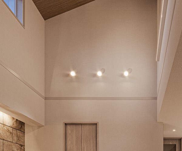【アクセントウォール・間接照明】深みのある素材に柔らかな光が陰影を添え、上質さを演出。