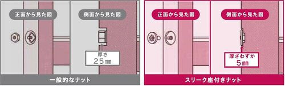 「構造体を傷つけない」方針のもと、接合金物にもこだわっています。木材を深く削らず固定するスリーク座付きナットや、斜め形状で強度を高めた共同開発のデフコーナーを採用し、耐震性を高めています。