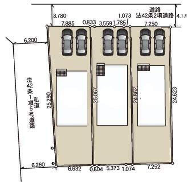 | 駐車場 | 2台 ~ 3台 | 道路の幅員 | 道路幅:4.1m~6.2m、アスファルト舗装 |